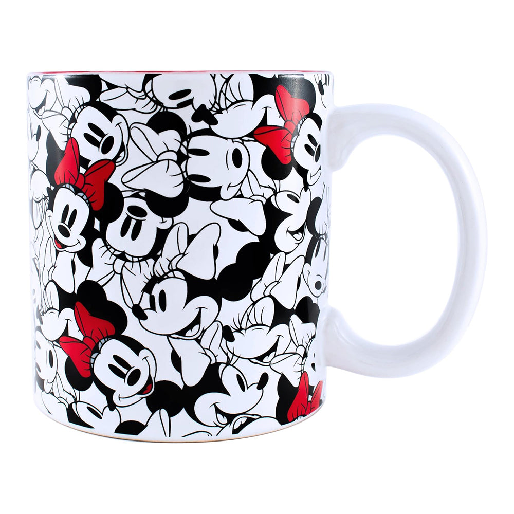 Disney Minnie Mouse All Over Mug 20 oz. Featuring Minnie Mouse faces all over and adorned with random red bows from Disney's Mickey Mouse series. Each mug features a unique all-over print, varying with each piece.