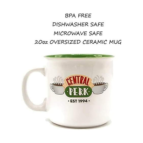 Enjoy your favorite beverage in style with the Friends Central Perk Ceramic Camper Mug. Featuring a spacious 20 oz capacity, this mug is perfect for a cup of coffee or tea while on the go. Its ceramic construction ensures durability while also adding a touch of nostalgia with its iconic Central Perk design.