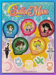 Sailor Moon Characters and Symbols Large Sticker Set featuring the main sailor guardians: Sailor Mercury, Sailor Moon, Sailor Mars, Sailor Jupiter and Sailor Venus plus the cats Luna and Artemis and the planetary symbols for the main sailor guardians from the anime and manga series. Includes tag containing official licensing information.