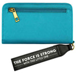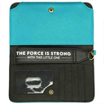 This bi-fold wallet is perfect for any Star Wars fan, featuring Grogu and text The Force Is Strong With This Little One on the wristlet. Crafted with high-quality materials, it offers a durable and stylish way to carry your cards and cash. A must-have accessory for any fan of the popular TV series.