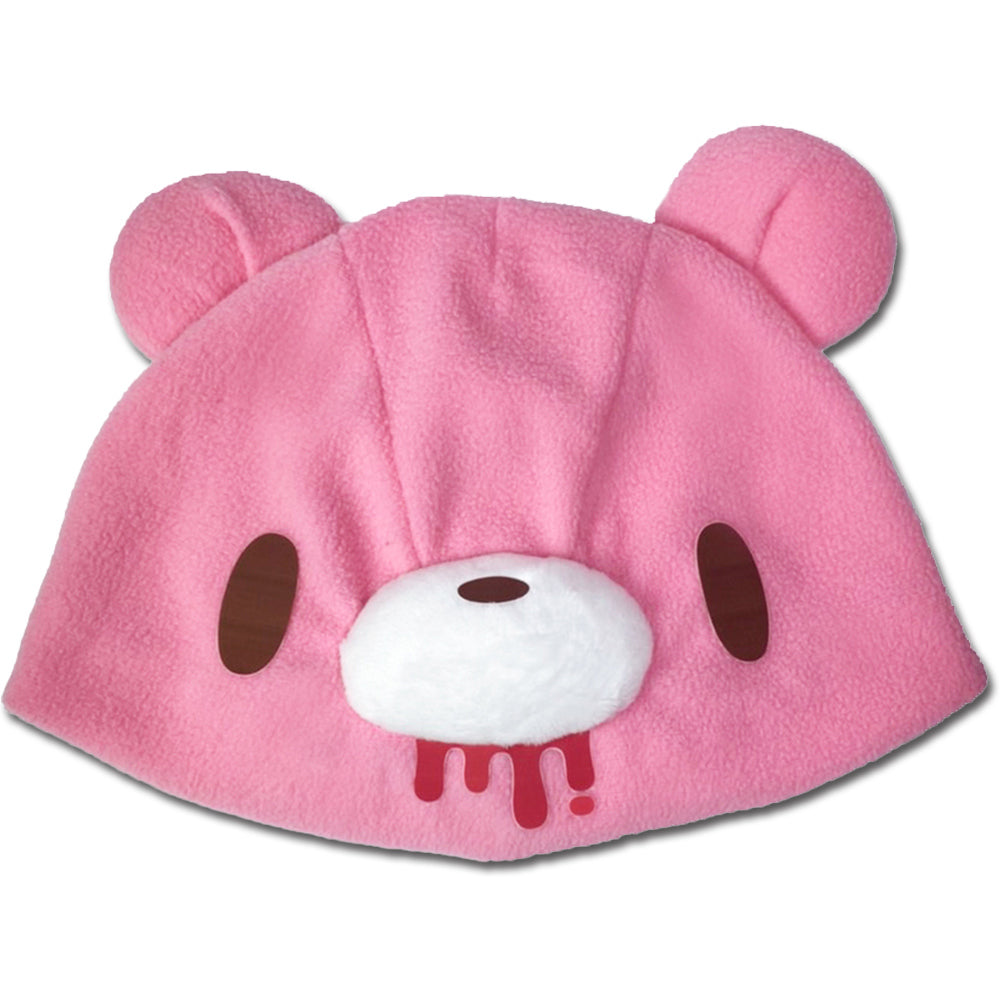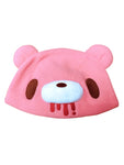 Gloomy Bear Pink Gloomy Bear Fleece Hat Cap. Featuring Pink Gloomy Bear with red blood dripping from mouth, brown eyes, white nose and plump ears. Includes tags containing official licensing information. Officially Licensed by Mori Chack.