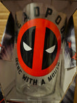 Marvel Deadpool Logo Pint Glass 16 oz (473 ml). Featuring Deadpool logo and the text "Merc With A Mouth" from the Marvel series.