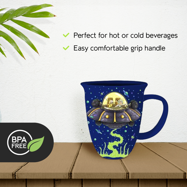 Rick and Morty Spaceship Mug 16 oz (473 ml). Featuring Rick & Morty in spaceship and planets in the background on a deep blue mug from the Adult Swim series.