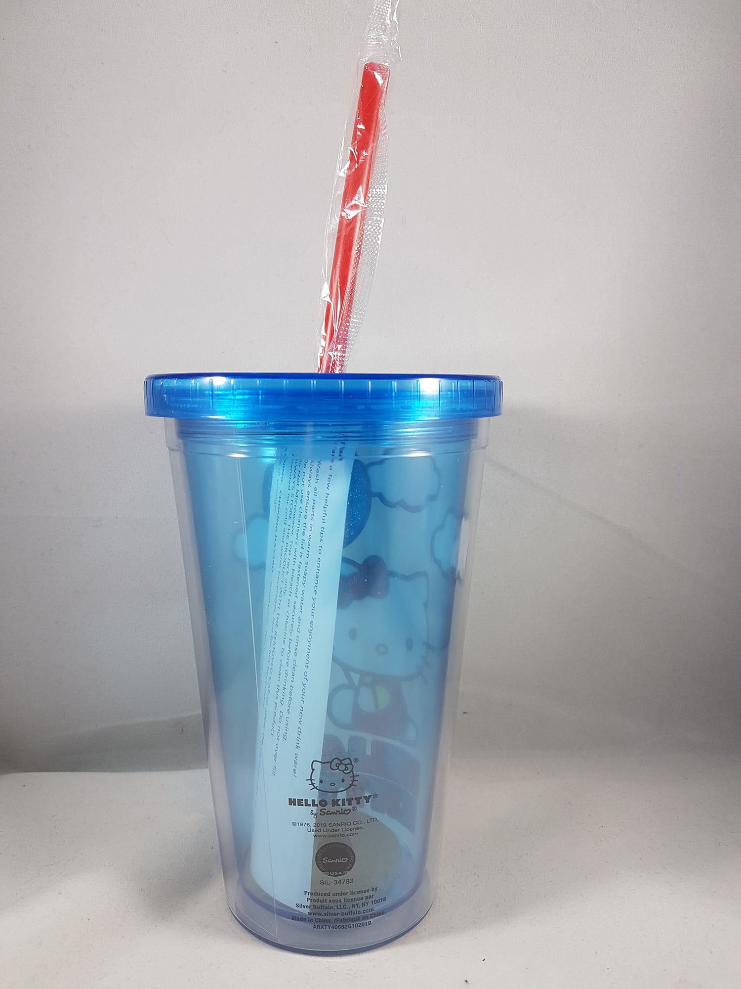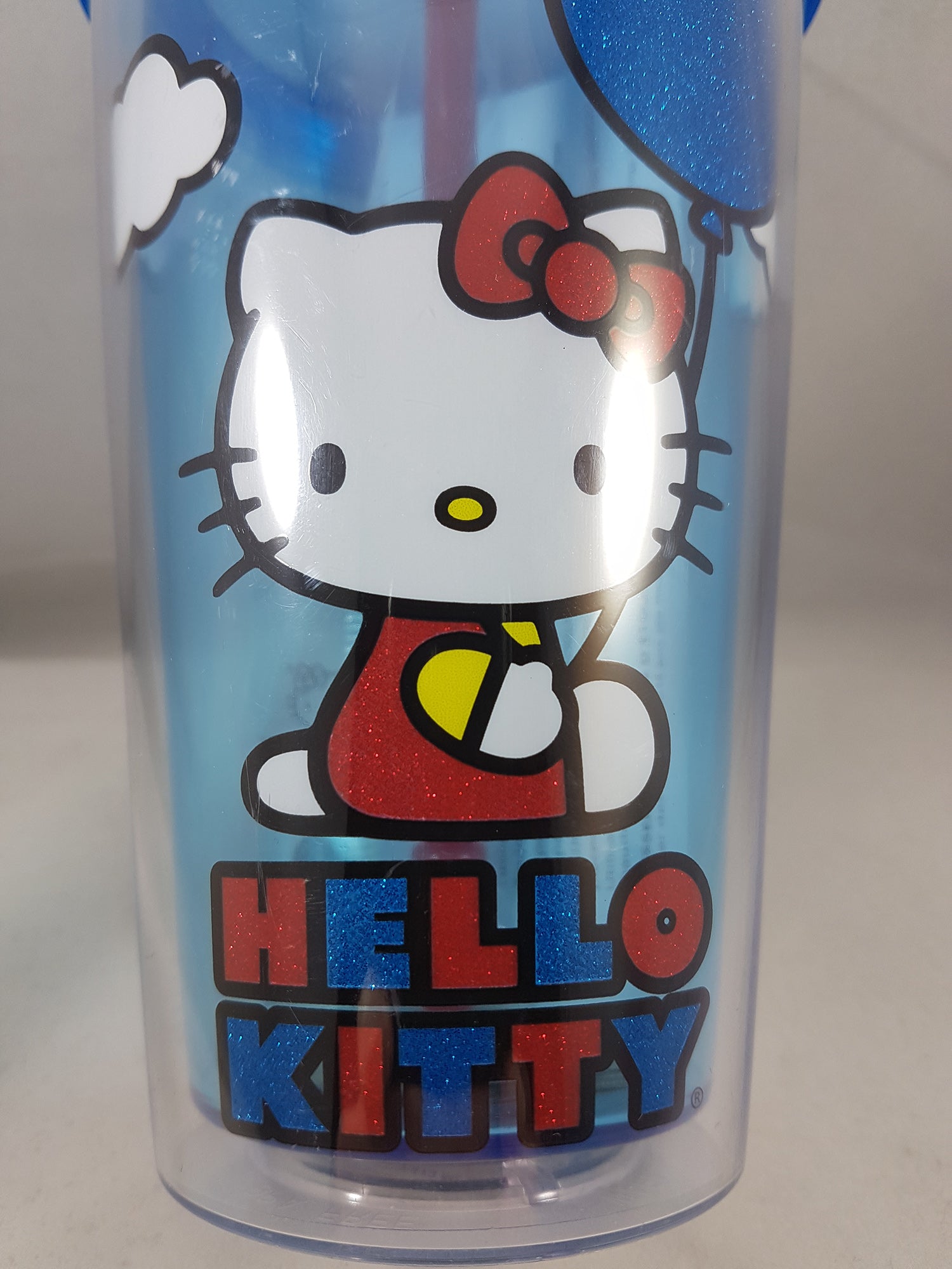 Sanrio Hello Kitty Balloons Tumbler 16 oz. Featuring Hello Kitty holding balloons with clouds and glittery graphics. May Include red or green straw, if preference please leave a note at checkout.