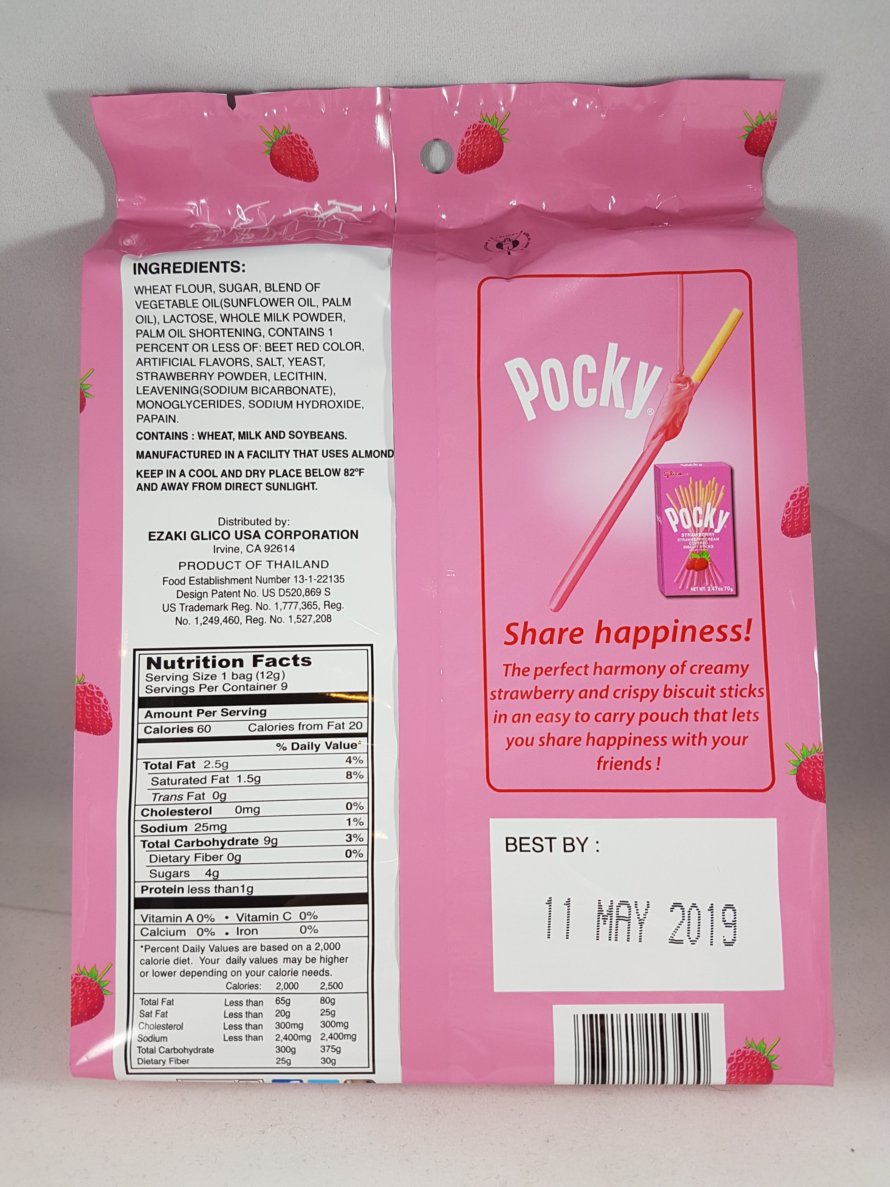 Strawberry Pocky Family Pack 3.95 oz (9 Pack) comes in a great Family sized value pack. There are 9 containers in each pack, and each one holds 7 sticks, enough to share with the whole family, and maybe even the neighbors. Strawberry Pocky makes for great desserts, or every day snacks. They're easy to travel snacks and taste great at any time.